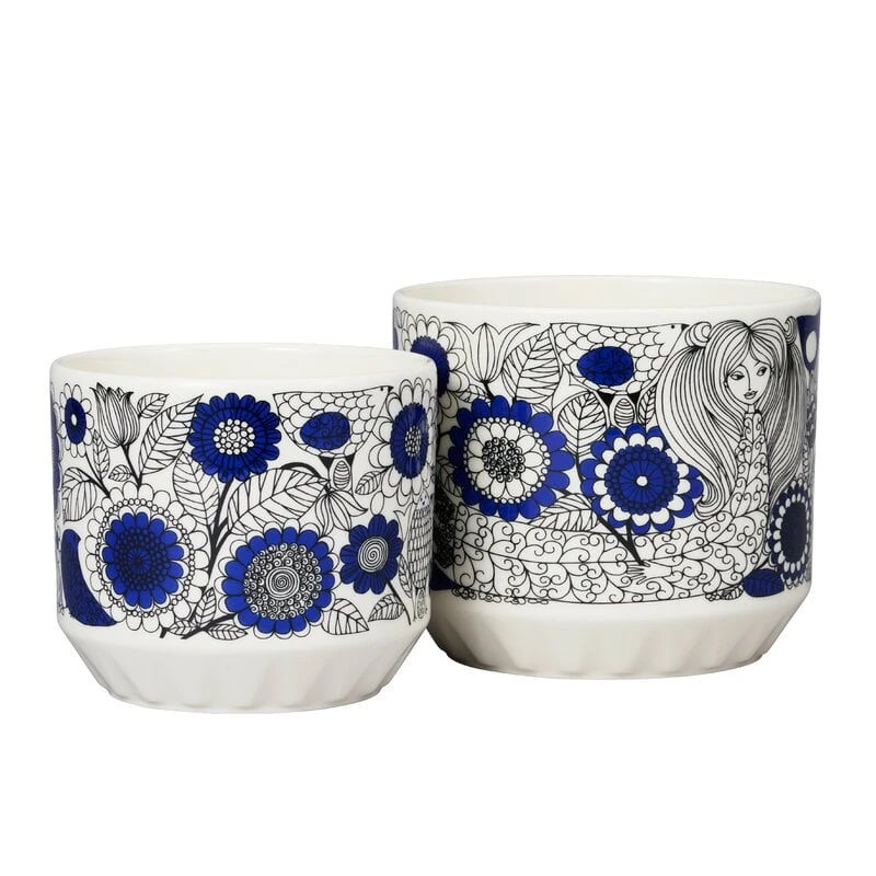 Le pot de fleurs Pastoraali d’Arabia est orné d’un motif organique dessiné par Esteri Tomula en 1965. Mettant en scène des personnages humains parmi des fleurs, des feuilles et des oiseaux, Pastoraali se pare d’une profonde nuance de bleu, la nouvelle technique de sérigraphie permettant désormais l’utilisation de couleurs vives. Les riches paysages pastoraux ont été imprimés sur un pot de fleurs en céramique blanche aux lignes épurées.