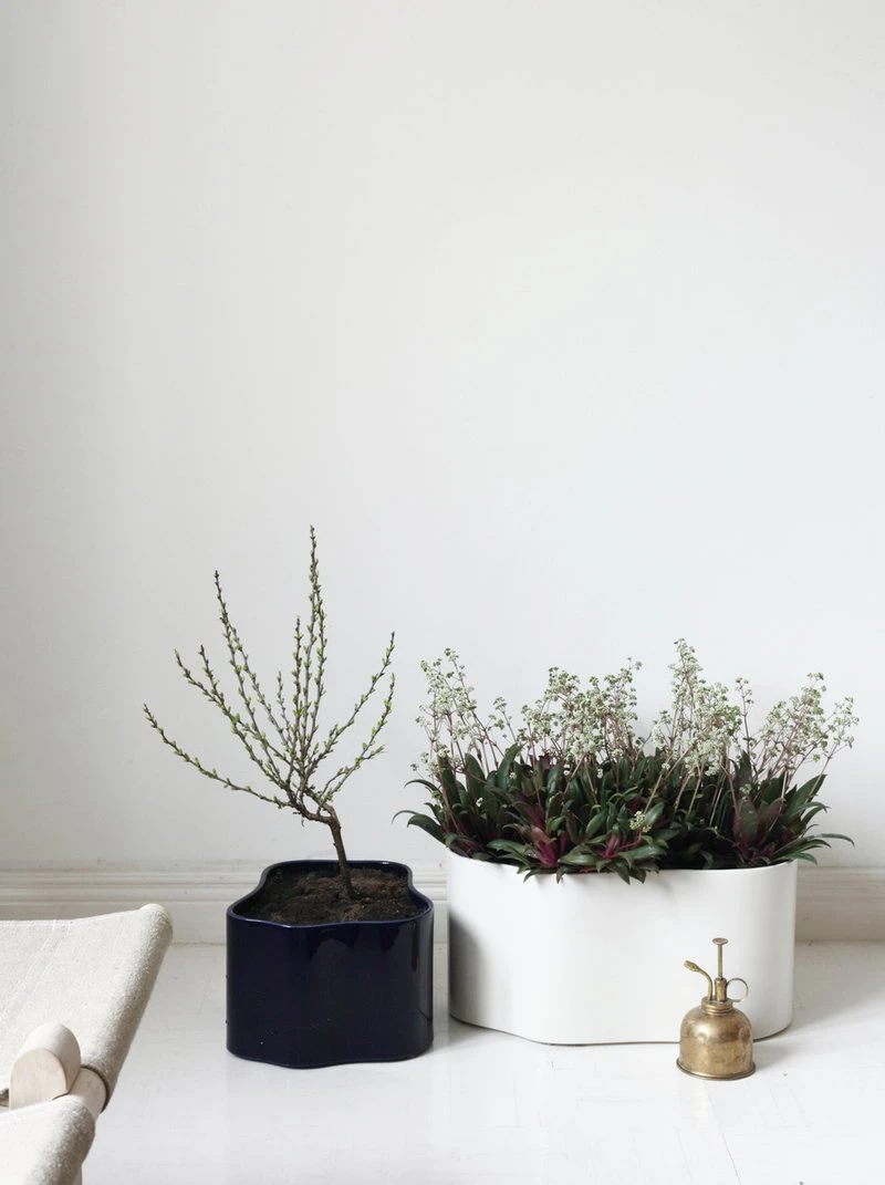 | Les pots de fleurs Riihitie, conçus par Aino Aalto pour la maison familiale à Helsinki, faisaient partie de la collection présentée par les Aalto à l’Exposition universelle de Paris en 1937. Quatre-vingts ans plus tard, Artek a lancé les jardinières en céramique qui doivent leurs noms à l’adresse où elles se trouvent, pour célébrer le centenaire de l’indépendance de la Finlande. Les pots de fleurs Riihitie sont fabriqués à la main, et les couleurs bleu et blanc ont été inspirées par les carreaux de céramique de la Maison expérimentale de Muuratsalo, également connue comme étant le refuge de la famille pour l’été. Le design naturel et ondulé des pots reflète le lien étroit que les Aalto entretiennent avec la nature. |