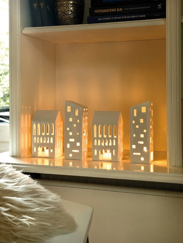 Les lanternes Urbania de Kähler offrent une alternative moderne aux lanternes plus traditionnelles en forme de maison. Les lanternes en céramique, conçues par Mette Bache et Barbara Bendix Becker, représentent une variété de bâtiments où la lumière des bougies, reflétée par des fenêtres de formes diverses, crée des motifs fascinants dans leur environnement.